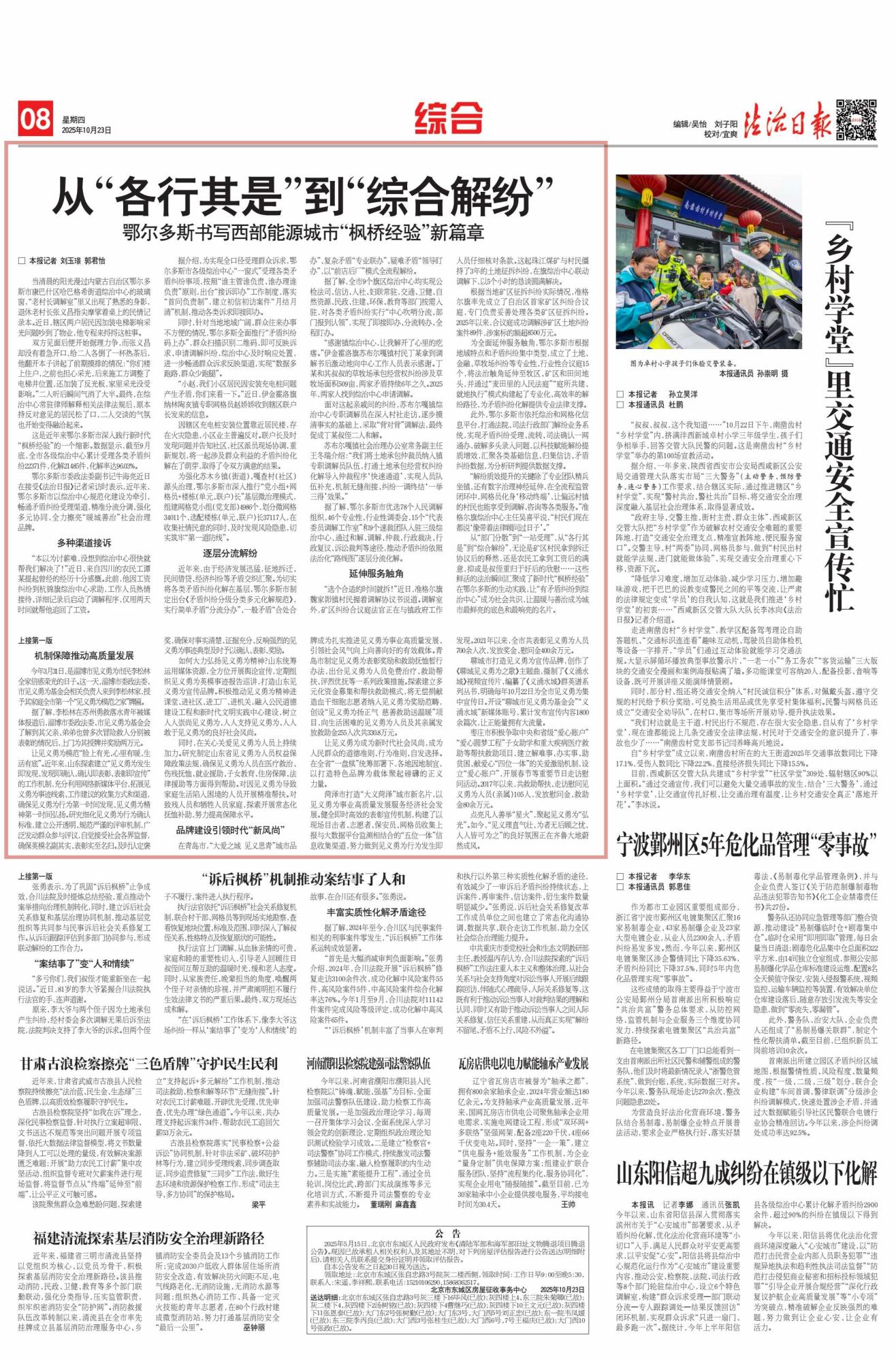 2025年10月23日,《法治日報》第8版刊發(fā)題為《從“各行其是”到“綜合解紛”鄂爾多斯書寫西部能源城市“楓橋經(jīng)驗(yàn)”新篇章》的文章,報道了鄂爾多斯市以綜治中心規(guī)范化建設(shè)為核心,深入踐行新時代“楓橋經(jīng)驗(yàn)”,通過多元舉措化解矛盾糾紛,全力打造“暖城善治”社會治理品牌。截至9月底,全市各級綜治中心累計受理各類矛盾糾紛22371件,化解率達(dá)96.03%。