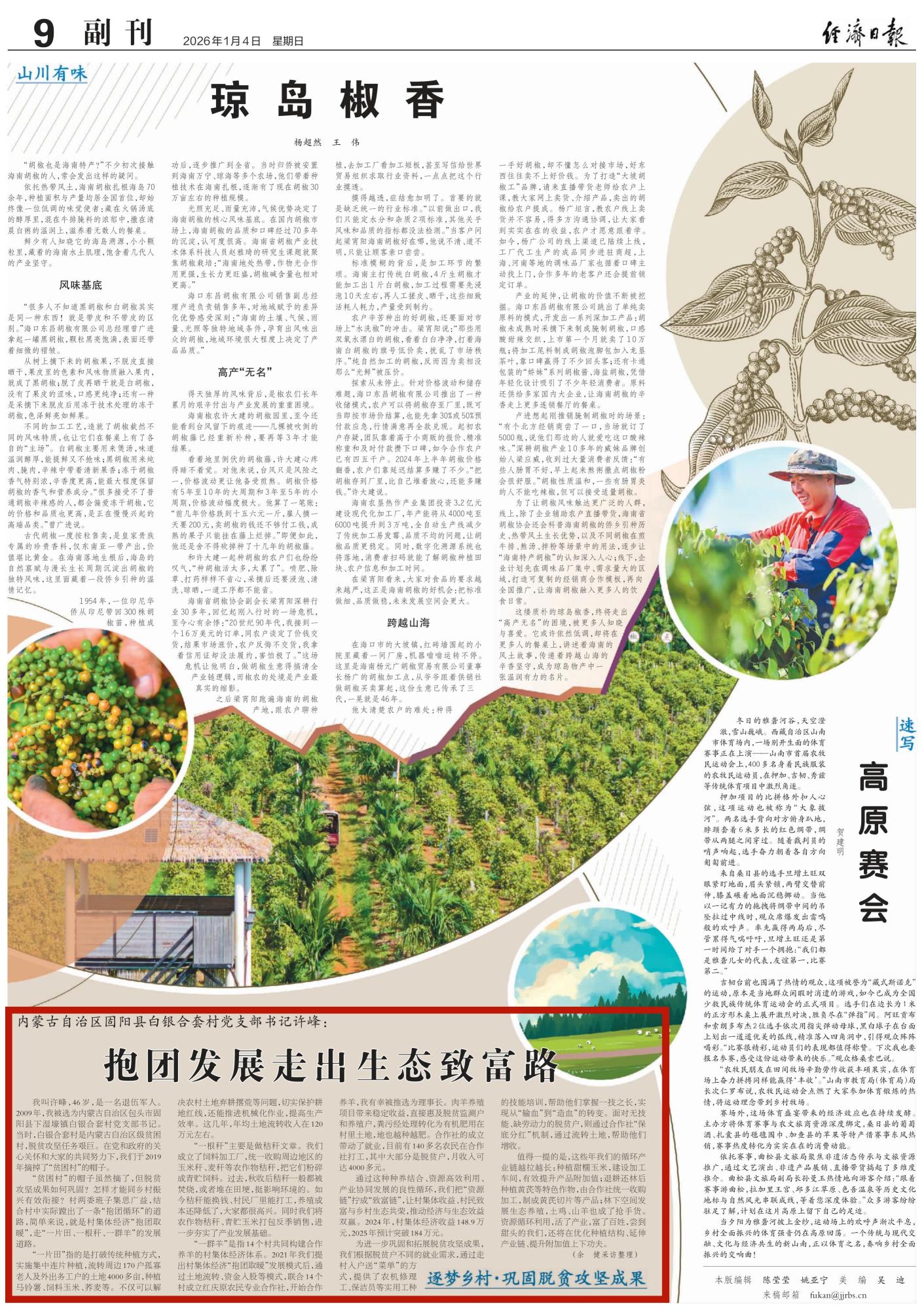 2026年1月4日,《經(jīng)濟(jì)日報(bào)》第9版刊發(fā)題為《內(nèi)蒙古自治區(qū)固陽縣白銀合套村黨支部書記許峰:抱團(tuán)發(fā)展走出生態(tài)致富路》的文章,介紹了內(nèi)蒙古自治區(qū)固陽縣白銀合套村通過種養(yǎng)結(jié)合、資源高效利用、產(chǎn)業(yè)協(xié)同發(fā)展的良性循環(huán),把“資源鏈”擰成“致富鏈”,推動經(jīng)濟(jì)與生態(tài)效益雙贏的做法。