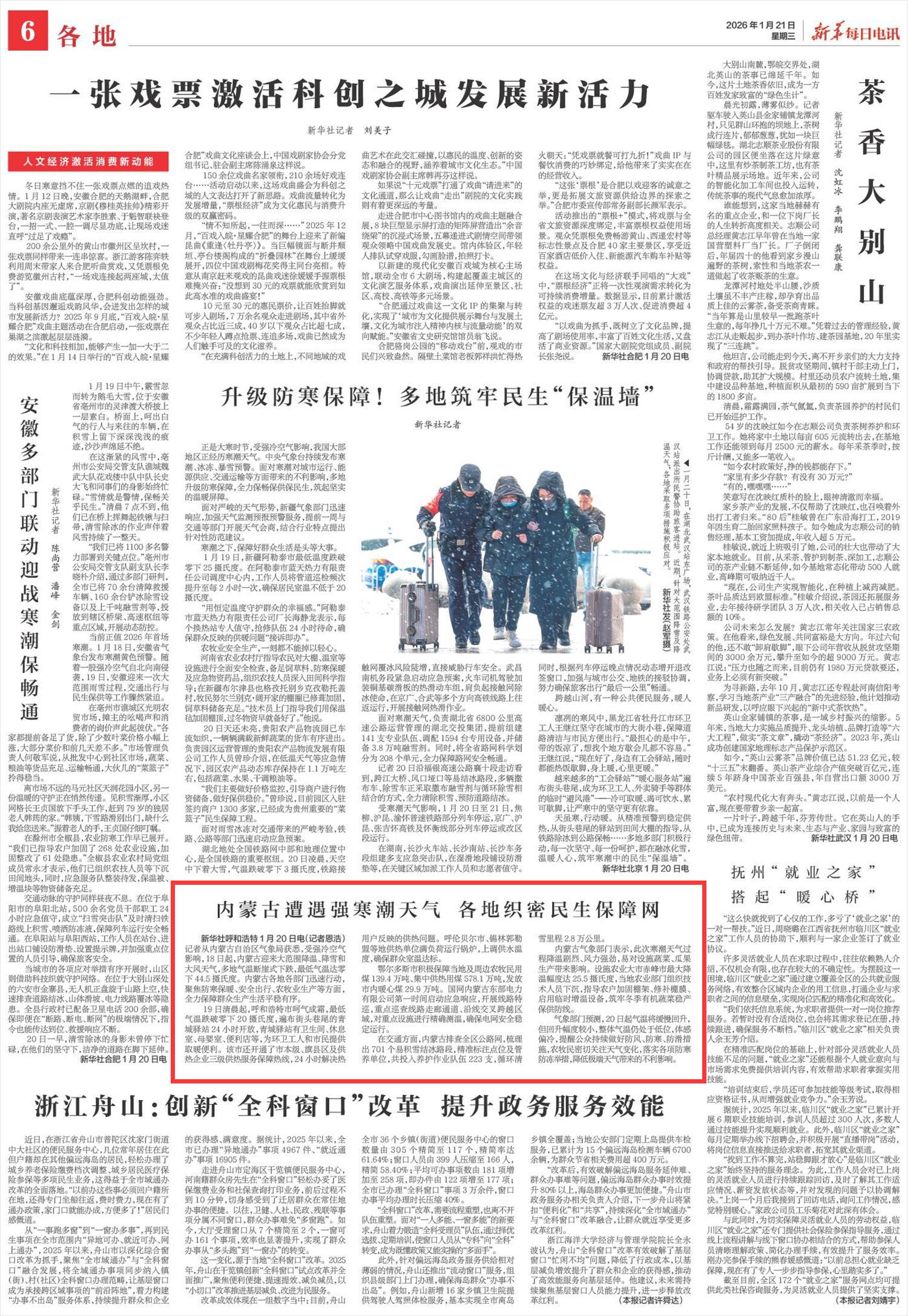 2026年1月21日《新華每日電訊》第6版刊發(fā)了《內(nèi)蒙古遭遇強(qiáng)寒潮天氣 各地織密民生保障網(wǎng)》的文章,報(bào)道了內(nèi)蒙古迎來(lái)大范圍降溫、降雪和大風(fēng)天氣,多地氣溫?cái)嘌率较碌?,最低氣溫達(dá)零下44.5攝氏度。各地各部門迅速行動(dòng),聚焦防寒保暖、安全出行、農(nóng)牧業(yè)生產(chǎn)等方面,全力保障群眾生產(chǎn)生活平穩(wěn)有序。