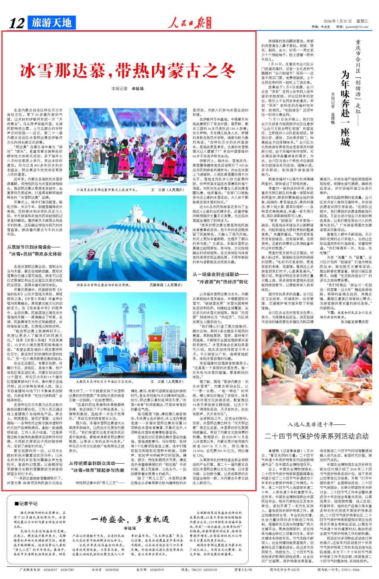 2026年1月21日《人民日報海外版》第12版刊發(fā)了《冰雪那達慕,帶熱內(nèi)蒙古之冬》的文章,報道了近年來,內(nèi)蒙古各地依托冰雪資源稟賦,將傳統(tǒng)民俗與冰雪旅游相結(jié)合,推動那達慕從草原走進城市、由夏季向冬季延伸,打造具有鮮明地域特色的“冰雪那達慕”品牌,為內(nèi)蒙古冬季文旅注入新活力。