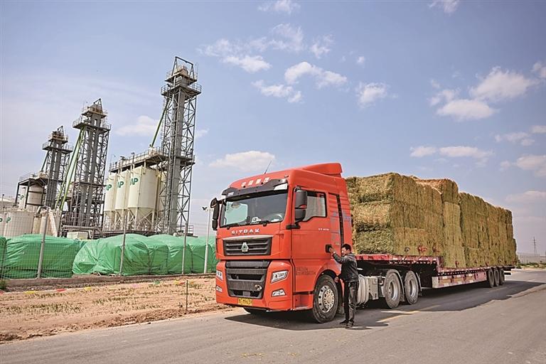 在內(nèi)蒙古赤峰市阿魯科爾沁旗,滿載牧草的貨車(chē)準(zhǔn)備啟程。新華社發(fā)