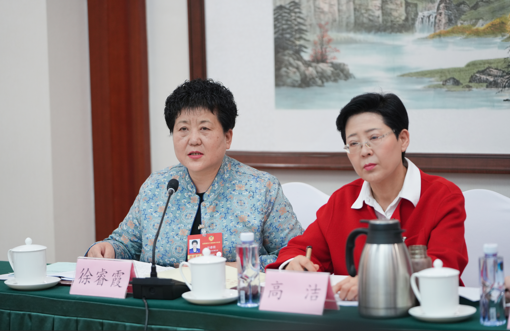 3月5日,住內(nèi)蒙古全國政協(xié)委員徐睿霞(左)建議,設(shè)立烏梁素海生態(tài)保護(hù)與系統(tǒng)治理專項(xiàng)基金,開展跨學(xué)科聯(lián)合攻關(guān),重點(diǎn)研發(fā)低成本、生態(tài)友好的底泥污染治理與資源化利用技術(shù)。草原云記者 王鵬 攝