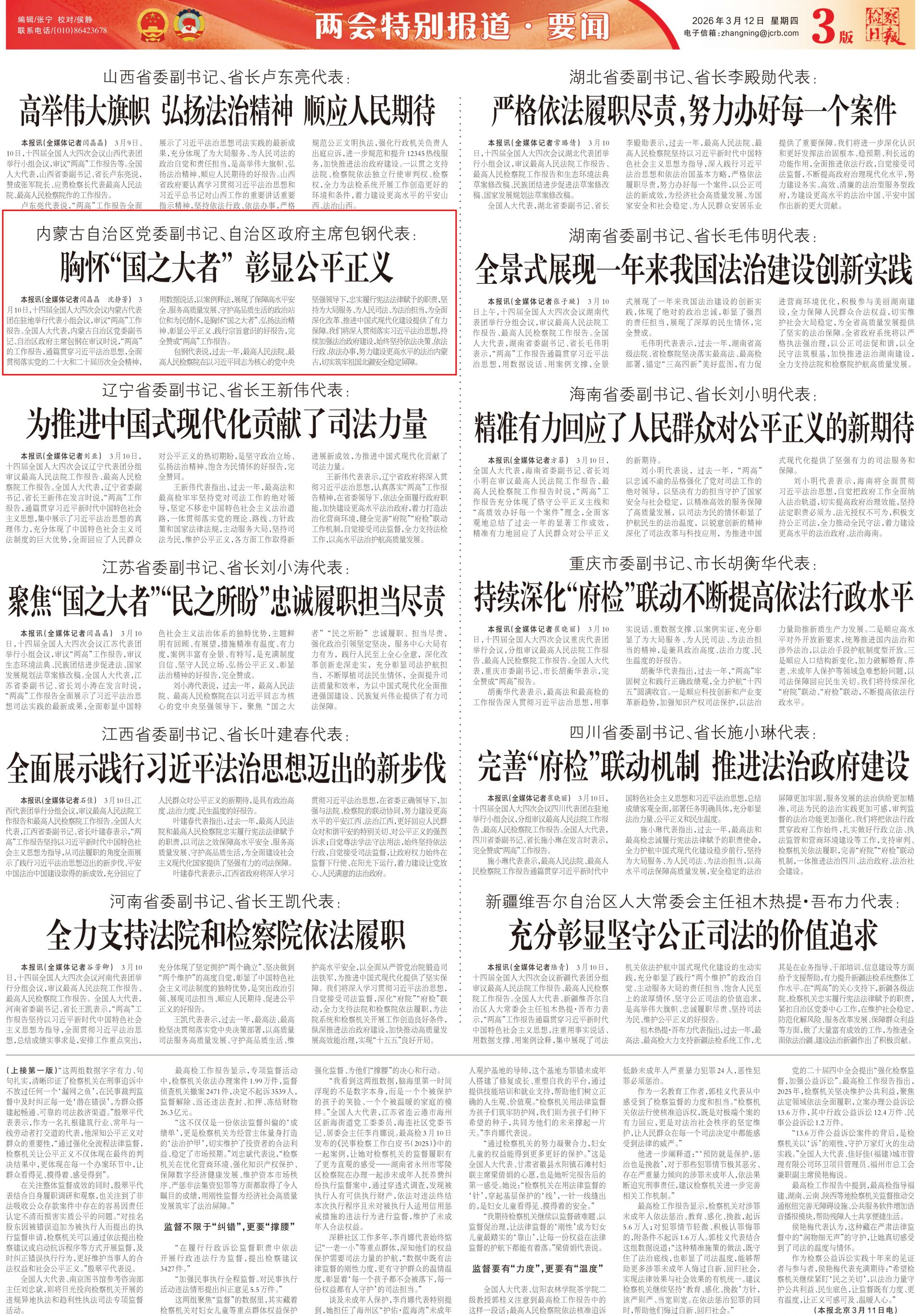 2026年3月11日《檢察日?qǐng)?bào)》第3版刊發(fā)了《內(nèi)蒙古自治區(qū)黨委副書記、自治區(qū)政府主席包鋼代表: 胸懷“國之大者” 彰顯公平正義 》的文章,報(bào)道了十四屆全國人大四次會(huì)議內(nèi)蒙古代表團(tuán)在駐地舉行代表小組會(huì)議,審議“兩高”工作報(bào)告。全國人大代表,內(nèi)蒙古自治區(qū)黨委副書記、自治區(qū)政府主席包鋼在審議時(shí)說,“兩高”的工作報(bào)告,通篇貫穿習(xí)近平法治思想,全面貫徹落實(shí)黨的二十大和二十屆歷次全會(huì)精神,用數(shù)據(jù)說話,以案例釋法,展現(xiàn)了保障高水平安全、服務(wù)高質(zhì)量發(fā)展、守護(hù)高品質(zhì)生活的政治站位和為民情懷,是胸懷“國之大者”、弘揚(yáng)法治精神、彰顯公平正義、踐行宗旨意識(shí)的好報(bào)告,完全贊成“兩高”工作報(bào)告。