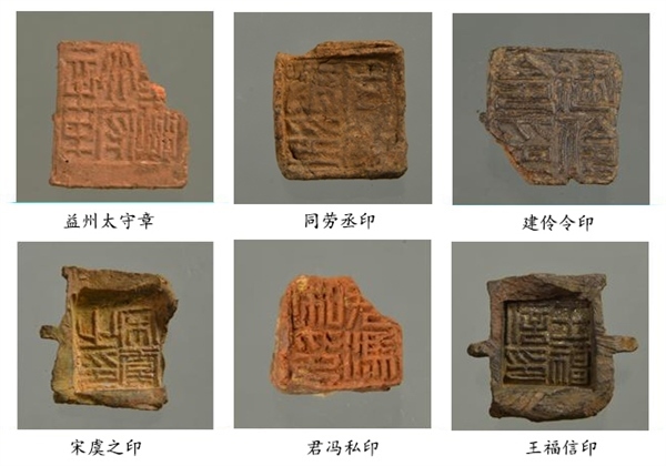 封泥集中出土于北部發(fā)掘區(qū)東北角的河道廢棄堆積中,共計(jì)837枚。主要為官印封泥和私印封泥,其中官印封泥有“益州太守章”“建伶令印”“同勞示印”等,涵蓋了漢代益州郡 24 縣中的20個(gè)縣名。出土帶字簡(jiǎn)牘殘片 1000 余枚,不帶字的簡(jiǎn)牘殘片近萬(wàn)枚。其中,帶字簡(jiǎn)牘中釋讀出“滇池以亭行”“建伶”“始元四年”等文字,應(yīng)是公文文書。