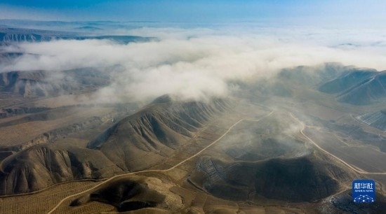 當日,寧夏吳忠市同心縣的山谷間出現(xiàn)云海景觀,農(nóng)田、旱塬、公路在霧中若隱若現(xiàn),景色壯美。