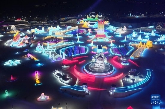 2月25日,游客在哈爾濱冰雪大世界園區(qū)游玩。