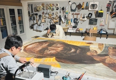 二〇二二年底,工作人員正在觀察油畫《父親》并準備進行修復。 寇旭乾攝