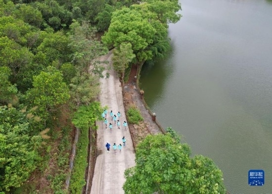 在海南瓊中縣舉辦的中國(guó)足協(xié)女足青訓(xùn)中心“希望杯”U12組比賽的空閑時(shí)段,四川隊(duì)隊(duì)員在賓館內(nèi)部道路跑步(無人機(jī)照片,4月10日攝)。