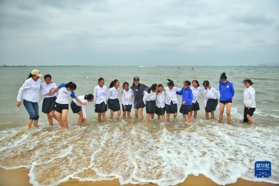 在海南瓊中縣舉辦的中國(guó)足協(xié)女足青訓(xùn)中心“希望杯”U12組比賽結(jié)束后,四川隊(duì)教練團(tuán)隊(duì)帶領(lǐng)隊(duì)員在海邊游玩(4月11日攝)。