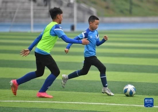 在瀘州天立春雨學(xué)校足球場(chǎng),來自涼山彝族自治州的金貴坤(右)與隊(duì)友進(jìn)行訓(xùn)練(3月28日攝)。
