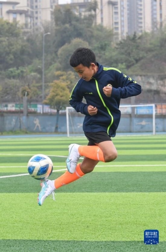 在瀘州天立春雨學(xué)校足球場(chǎng),來自涼山彝族自治州的楊坤在進(jìn)行訓(xùn)練(3月29日攝)。