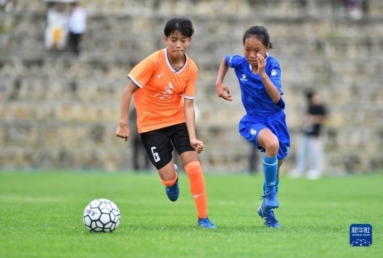 在海南瓊中縣舉辦的中國(guó)足協(xié)女足青訓(xùn)中心“希望杯”U12組四川隊(duì)對(duì)陣廣東隊(duì)的比賽中,來自涼山彝族自治州的四川隊(duì)球員舍布么扯鳩莫(右)奮力拼搶(4月10日攝)。
