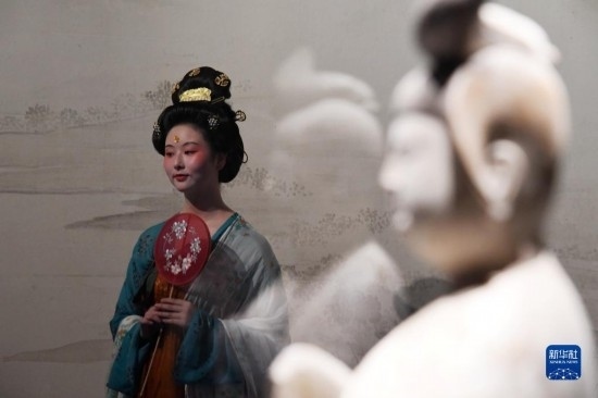 5月22日晚,在西安博物院《長安有故里——絲路少年大唐行》展覽上,身著復(fù)原唐裝的演員與游客互動(dòng)。