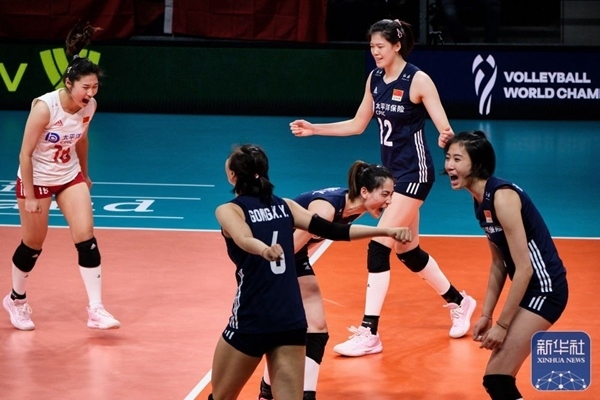 中國隊球員在比賽中慶祝得分。2022年9月28日,在荷蘭阿納姆舉行的2022世界女排錦標(biāo)賽第一階段D組小組賽中,中國隊3:0戰(zhàn)勝日本隊。新華社記者 孟鼎博 攝