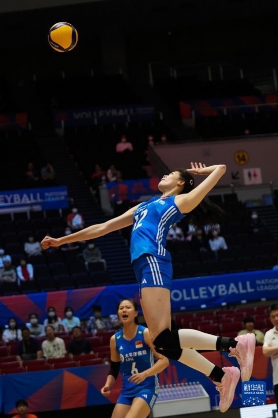 6月2日,中國(guó)隊(duì)球員袁心玥(中)在比賽中扣球。新華社記者 張笑宇 攝