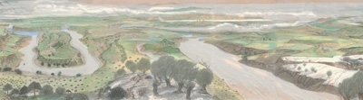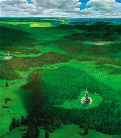 河北塞罕壩林場,是“三北”工程建設的重要區(qū)域?;脑兞趾5娜眽纹孥E,成為近年來主題性美術創(chuàng)作的重要課題。入選“筑夢——我們的新時代美術攝影作品展”的譚智群油畫《美麗的塞罕壩》,是在實地寫生基礎上的藝術提煉和情感升華。作者以俯視的構圖,鋪展?jié)M目蒼翠的美景。畫面左側,清澈的河流蜿蜒向前;畫面右側,白色的雁群逐綠翱翔;遠方,茂密的森林不斷延伸,風力發(fā)電機林立于山巔,畫面充滿生機與活力。同樣以俯視的角度處理構圖,孔亮油畫《美麗中國——塞罕壩》則以塞罕壩林場和塞罕塔為視覺中心,蔥蘢的綠意,將意境渲染得更加深邃。翁凱旋油畫《滄海桑田——塞罕壩的前世今生》,通過三聯(lián)畫的形式,在新舊對比中構建時空長廊,描繪出塞罕壩的時代變遷。