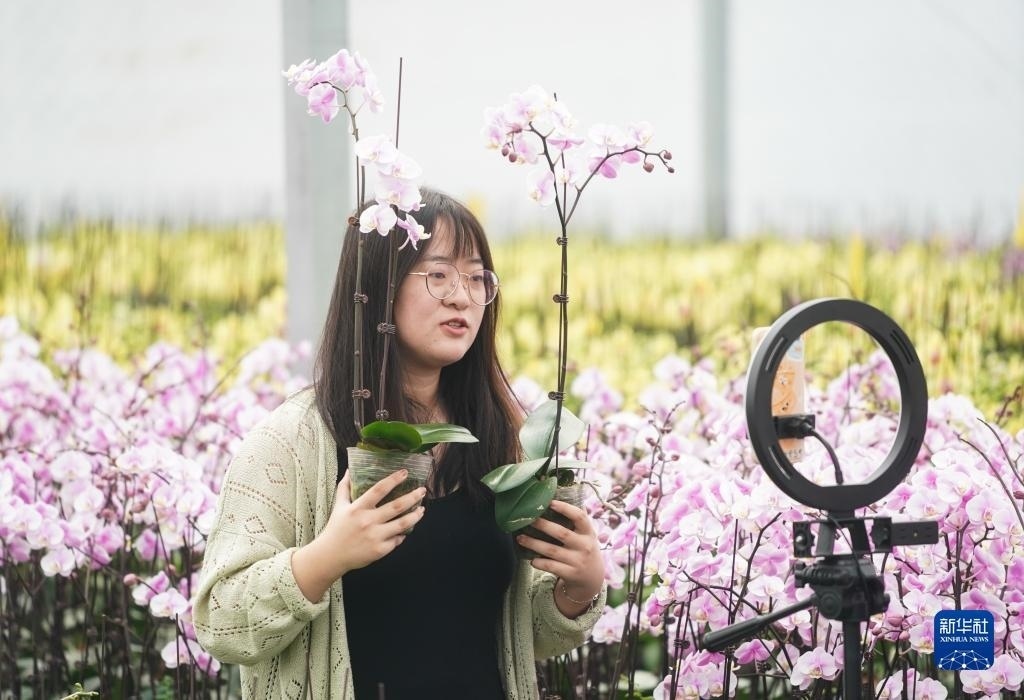 9月9日,工作人員在宿遷市王官集鎮(zhèn)蝴蝶蘭大世界大棚內(nèi)進行網(wǎng)絡(luò)直播。