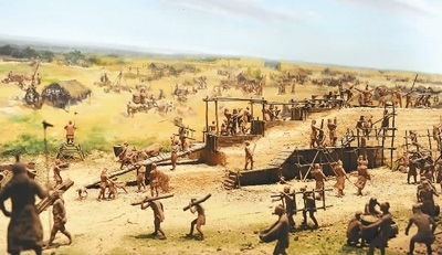 展廳里呈現(xiàn)的商代筑城場(chǎng)景。 鄭州商都遺址博物院供圖
