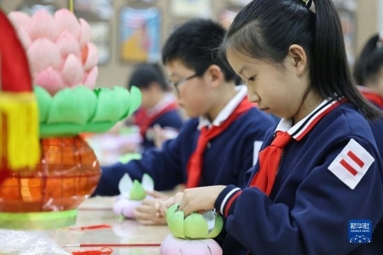 11月22日,河北省霸州市勝芳鎮(zhèn)紅光小學(xué)的學(xué)生在學(xué)習(xí)制作勝芳花燈。