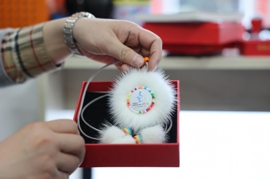 這是1月10日拍攝的以太陽花為底的“十四冬”紀(jì)念吊墜。新華社記者 王楷焱 攝