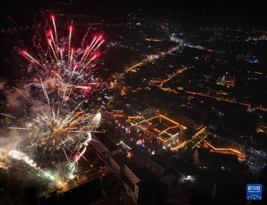 2月23日晚,古鎮(zhèn)舉行放銃花活動(無人機(jī)照片)。