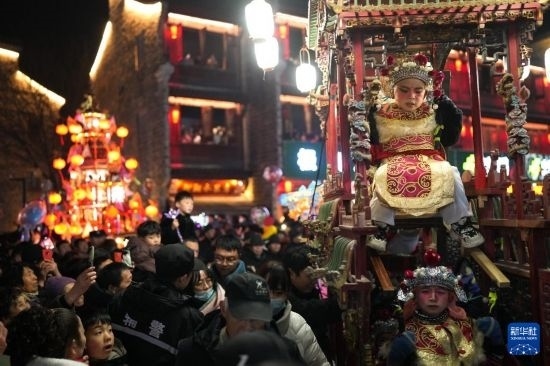 2月23日,小演員坐在鼓亭上巡游。