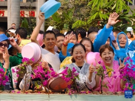 當(dāng)日,云南省西雙版納傣族自治州舉行潑水狂歡活動,人們歡聚在景洪市潑水廣場,用相互潑水的方式互送祝福,慶祝潑水節(jié)。