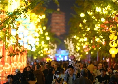 今年中秋假期,“京彩燈會”吸引了超過12萬名游客。國慶假期前4天,游客量達7萬余人。除了大飽眼福,燈會還設(shè)立150余家特色商鋪,覆蓋老字號、非遺、文創(chuàng)、餐飲美食等,豐富游客體驗。多家知名餐飲企業(yè)在燈會擺攤設(shè)點為游客服務,賞燈之余還能享受大廚現(xiàn)做的星級美食。