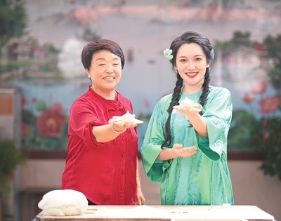 柳青瑤(右)身穿綠色老軟緞改良旗袍與煙臺市膠東花餑餑非遺傳承人曲麗榮錄制電視節(jié)目。本文配圖除標(biāo)注外均為受訪者供圖
