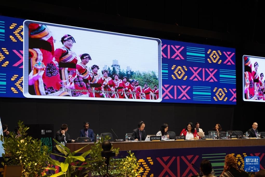 12月5日,在巴拉圭亞松森聯(lián)合國(guó)教科文組織保護(hù)非物質(zhì)文化遺產(chǎn)政府間委員會(huì)第19屆常會(huì)評(píng)審現(xiàn)場(chǎng),大屏幕播放“中國(guó)木拱橋傳統(tǒng)營(yíng)造技藝”宣傳視頻。新華社記者 朱雨博 攝