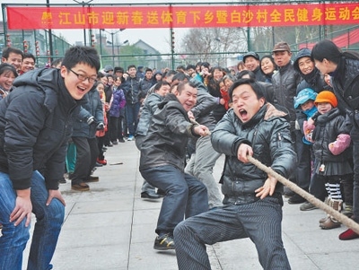 白沙村村民在村全民健身運動會上進行拔河比賽。