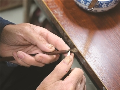 把毛料放在水中仔細(xì)清洗,就著燈光剔除一根根細(xì)微雜毛,將清理后的毛料聚合成圓直光滑、攏抱不散的錐形……走進(jìn)涇縣涇川鎮(zhèn)宣筆制作技藝代表性傳承人佘征軍的工作室,他正在為一支紫毫筆制作筆頭?!鞍拙右子性娫?,‘宣城之人采為筆,千萬毛中揀一毫’。此句講的是宣筆制作工藝的復(fù)雜精細(xì)。”佘征軍說。