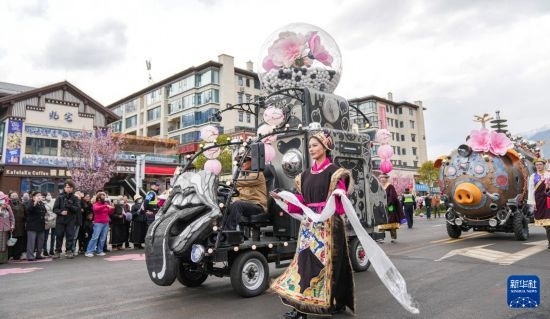 這是4月3日拍攝的林芝第二十二屆桃花旅游文化節(jié)花車巡游現(xiàn)場。