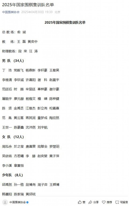 據(jù)國家圍棋集訓(xùn)隊(duì)選拔小組負(fù)責(zé)人介紹,根據(jù)《國家圍棋集訓(xùn)隊(duì)運(yùn)動(dòng)員入隊(duì)標(biāo)準(zhǔn)》,報(bào)中國圍棋協(xié)會批準(zhǔn),共有54人入選2025屆國家集訓(xùn)隊(duì)。男隊(duì)由王星昊、丁浩、黨毅飛、楊鼎新、李軒豪、李維清、李欽誠等34名棋手組成;女隊(duì)有12人,包括周泓余、於之瑩、唐嘉雯等。此外,國少隊(duì)還有8名棋手。國家圍棋集訓(xùn)隊(duì)的教練組由5人組成,俞斌擔(dān)任總教練,王磊、黃奕中擔(dān)任教練,段榮和汪濤任助理教練。