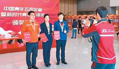 2025年4月30日,中國青年五四獎(jiǎng)?wù)卖咝聲r(shí)代青年先鋒獎(jiǎng)?lì)C獎(jiǎng)儀式在京舉行。趙亞杰(中)在頒獎(jiǎng)現(xiàn)場(chǎng)合影留念,拍攝照片的是快遞小哥欒玉帥,他也獲得了2025年度中國青年五四獎(jiǎng)?wù)隆?/p>