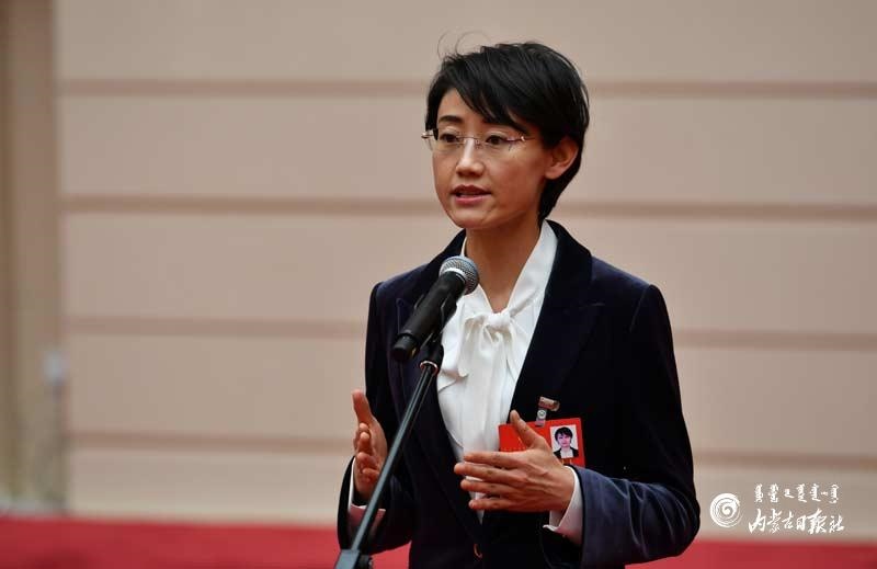 自治區(qū)政協(xié)委員曹紅回答記者提問。內(nèi)蒙古日報記者 馬建荃攝