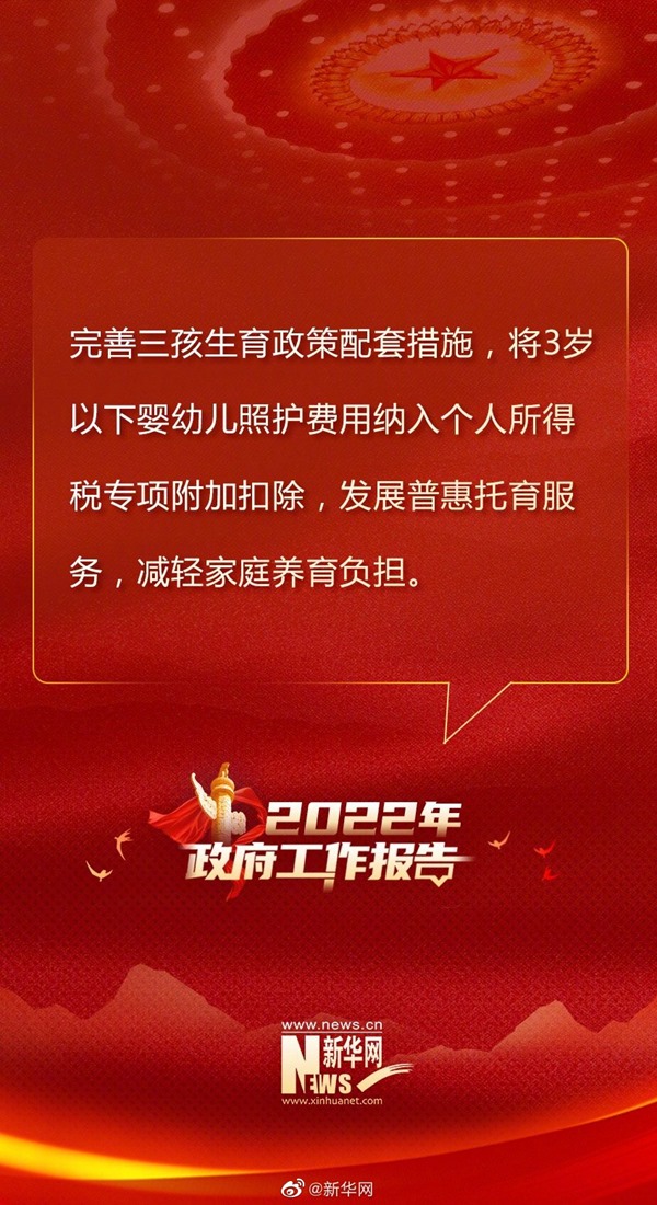 加強社會保障和服務(wù)。穩(wěn)步實施企業(yè)職工基本養(yǎng)老保險全國統(tǒng)籌,適當提高退休人員基本養(yǎng)老金和城鄉(xiāng)居民基礎(chǔ)養(yǎng)老金標準,確保按時足額發(fā)放。繼續(xù)規(guī)范發(fā)展第三支柱養(yǎng)老保險。加快推進工傷和失業(yè)保險省級統(tǒng)籌。做好軍人軍屬、退役軍人和其他優(yōu)撫對象優(yōu)待撫恤工作。積極應對人口老齡化,優(yōu)化城鄉(xiāng)養(yǎng)老服務(wù)供給,支持社會力量提供日間照料、助餐助潔、康復護理等服務(wù),鼓勵發(fā)展農(nóng)村互助式養(yǎng)老服務(wù),推動老齡事業(yè)和產(chǎn)業(yè)高質(zhì)量發(fā)展。完善三孩生育政策配套措施,將3歲以下嬰幼兒照護費用納入個人所得稅專項附加扣除,發(fā)展普惠托育服務(wù),減輕家庭養(yǎng)育負擔。強化未成年人保護。提升殘疾預防和康復服務(wù)水平。加強民生兜底保障和遇困群眾救助,努力做到應保盡保、應助盡助。