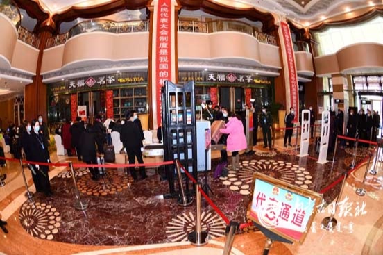 出席會(huì)議的人大代表正在通過安檢進(jìn)入駐地。