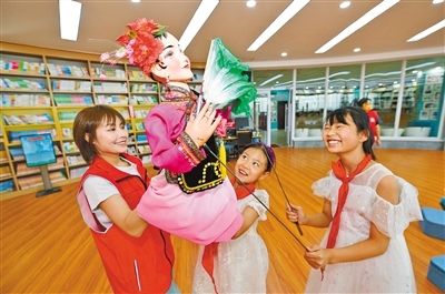 靳媛指導小學生學習杖頭木偶戲的操縱。