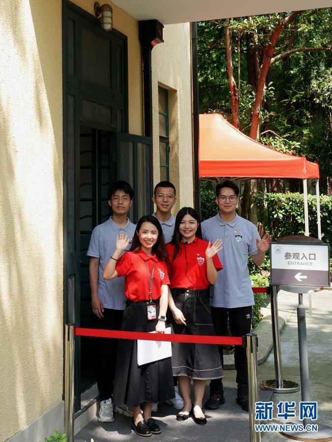 在復旦大學《共產(chǎn)黨宣言》展示館,一支名為“星火”的黨員志愿服務隊部分隊員在館前合影(2020年6月30日攝)。新華社記者 劉穎 攝
