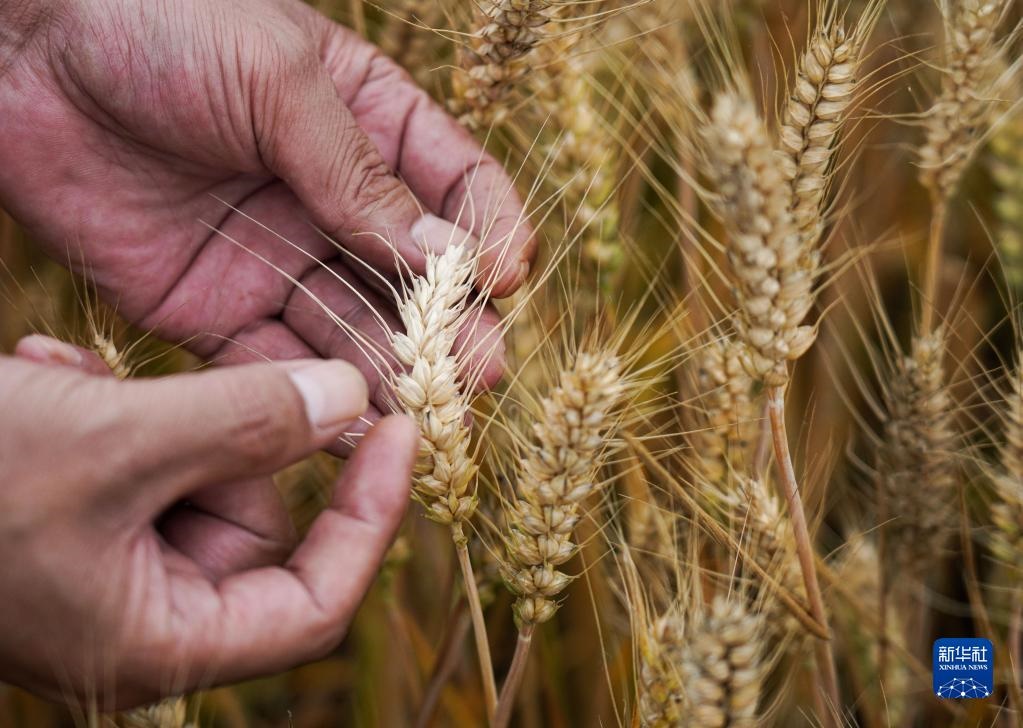農(nóng)戶在河南南陽一處高標(biāo)準(zhǔn)農(nóng)田內(nèi)查看小麥長勢(5月25日攝)。新華社記者 吳剛 攝